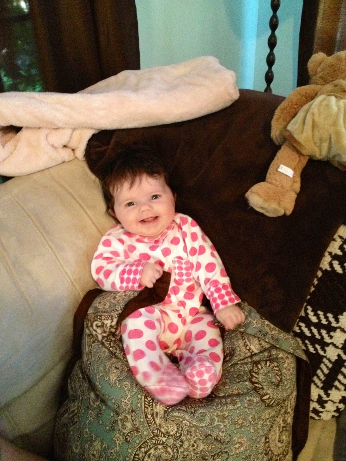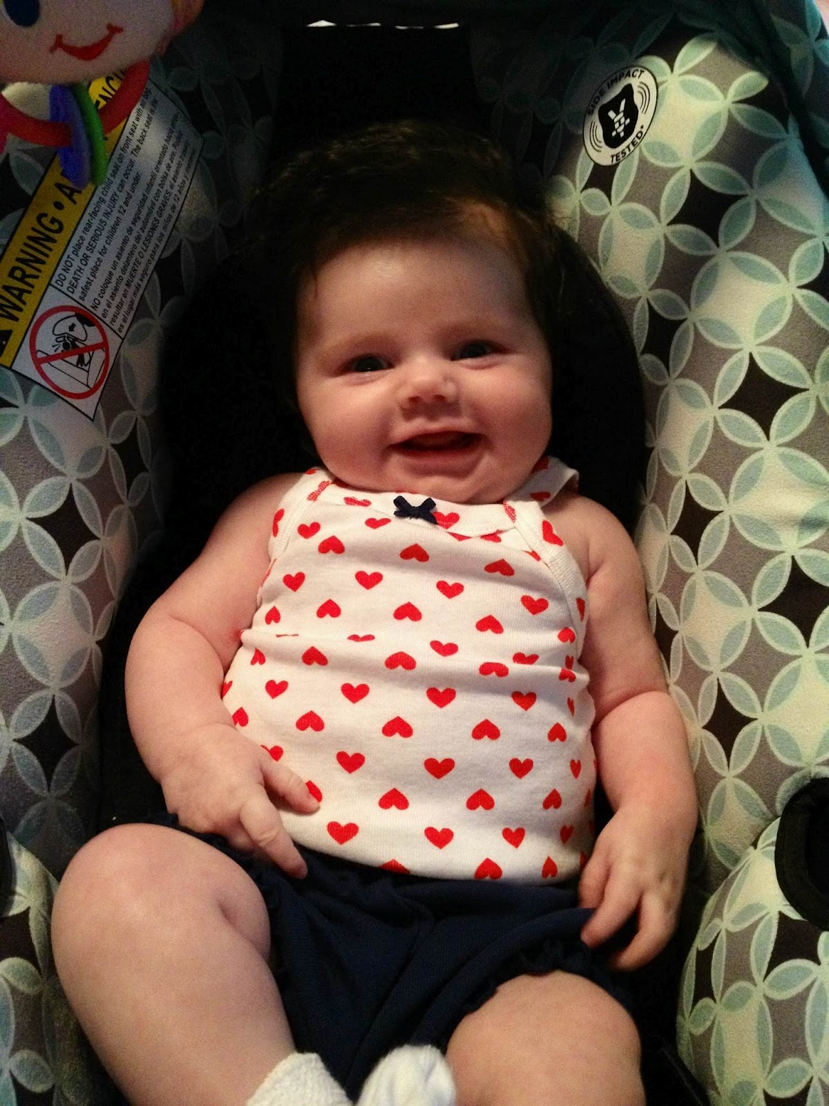 I must admit, I loved the novelty of a newborn, but this is where it's at! Smiles, giggles, loving glances, eye contact? What more could I want?? Every day is better than the last and I can feel her maturing more and more with each passing day. She LOVES to talk! I think it might be really good that Gabrielle is her middle name because boy is she gabby! I love when she talks to me and I respond, "Oh really?? I didn't know that!" or "You know all of the gossip and secrets...thanks so much for letting me know!" and then she just gets the biggest grin from ear to ear! That is my favorite. I love giving her positive reinforcement and I LOVE how grateful I am to be able to stay home with her and see these daily changes. She is such a happy and smiley baby. Seeing that smile really is the most amazing feeling in the whole world. I love seeing her interact with Chris, also. She loves her Daddy and gives him the most loving looks. We have been trying to get better at tummy time and I even got one smile out of her! Her head control is amazing already and her little head just bobs to and fro as I carry her around. She loves her ballerina Hello Kitty stuffed animal and her Mermaid that I call her MerLady. :) I decided to weigh her the other day and she is already 13 pounds! That puts her in the 73rd percentile! Not too bad for a baby that had initial weight gain issues. That sure does make me feel great! I find myself really protective of her. But what Mom is not protective? Now that she has gotten her 2 month shots, we have been out and about much more. She has been really great! We have had a play date with Audria Reeves and many lunch dates! And now that the Pumpkin Spice Latte is back (!!!) we frequent Starbucks and she likes to take the drive and go through the drive through. She now has a favorite game that really gets her giggling. Chris bounces her up and down and says "Mommy...Mommy...Mommy..." and I come at her smiling and she just giggles like crazy. With Fall approaching, I am looking forward to brisk walks and showing her the changing leaves. Whenever I take her out now, she does not quite understand what wind is. She gasps like she is inhaling it and it is pretty funny to watch. We are excited to take her to the Renaissance Faire that we go to every year. Oh, Arden...I have so much more to teach you in the next month and I know you have just as much to teach me!